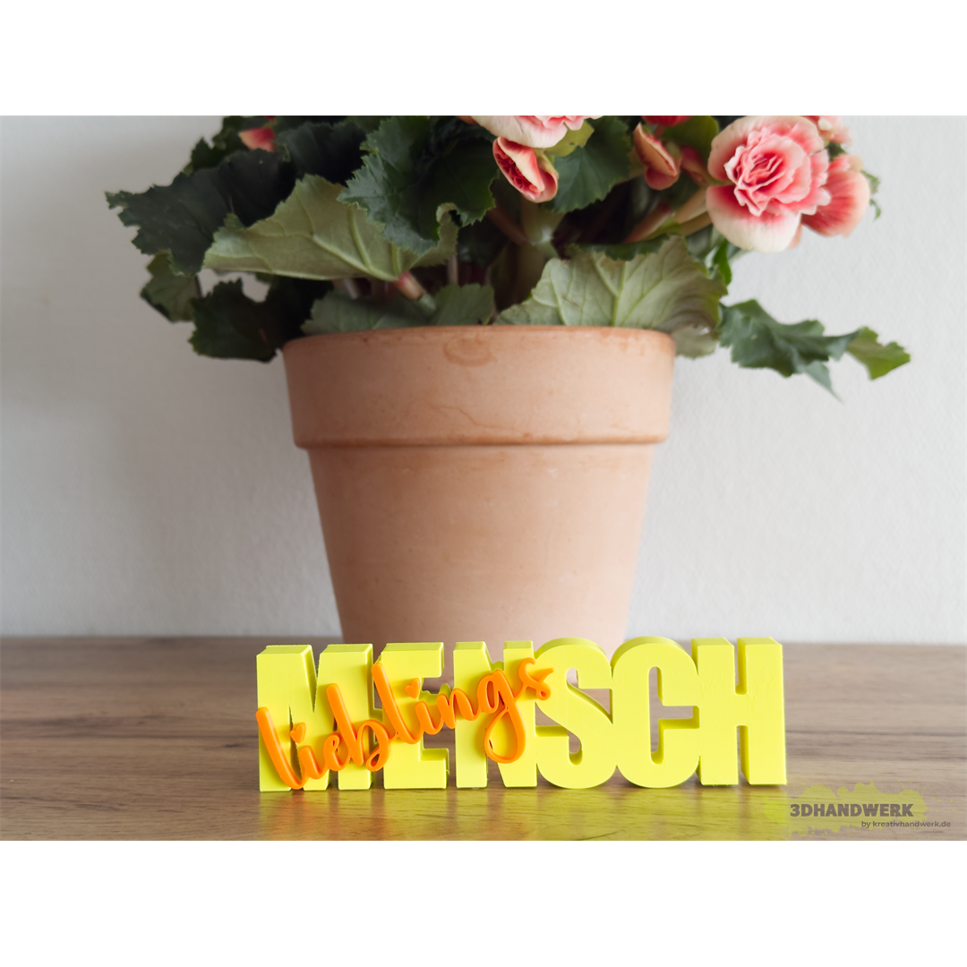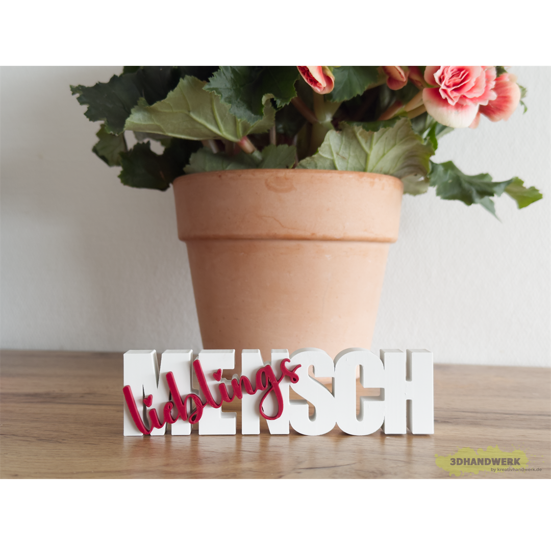 Mit diesem liebevoll gestalteten Schriftzug „Lieblingsmensch“ bringen Sie Ihre Wertschätzung auf ganz besondere Weise zum Ausdruck. Das dekorative 3D-Objekt verbindet klare, moderne Großbuchstaben mit einem verspielten, roten Schriftzug – ein echter Hingucker für jeden Raum. Ob im Wohnzimmer, auf dem Schreibtisch oder im Regal, dieses kleine Kunstwerk sorgt für eine warme Atmosphäre und erinnert täglich daran, wie wichtig ein Lieblingsmensch im Leben ist.